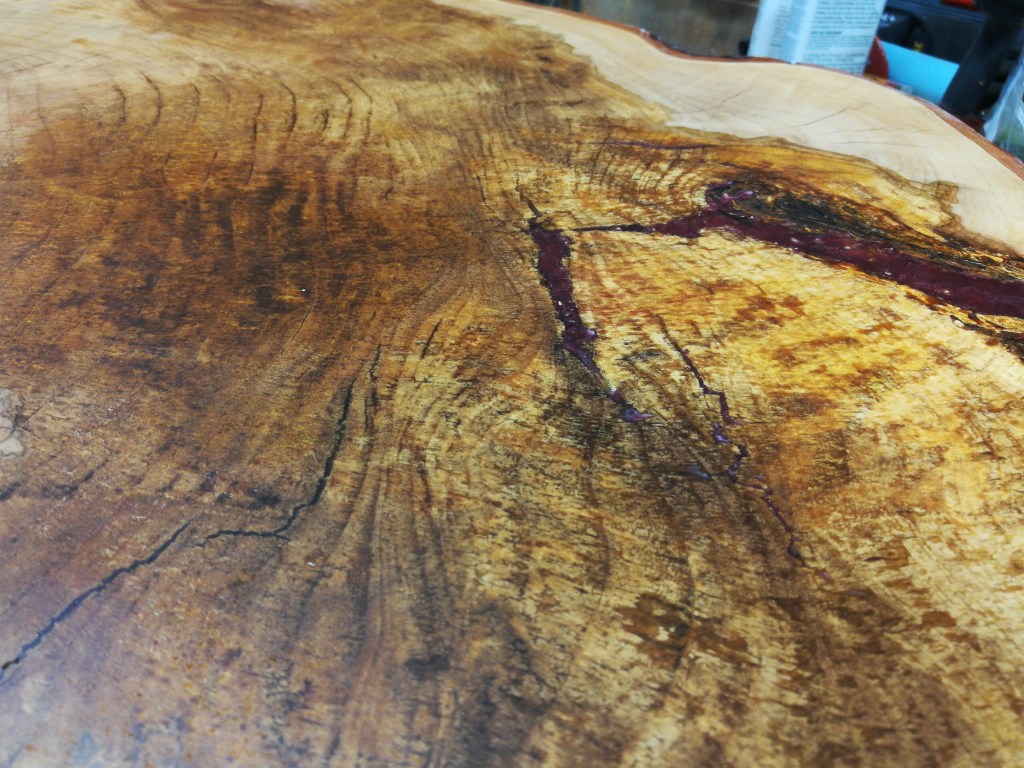 I don’t typically like the epoxy effects that some people do, so I strictly wanted the epoxy to be structural and not a feature. I mixed in some deep red dye so that it would not be entirely noticeable.