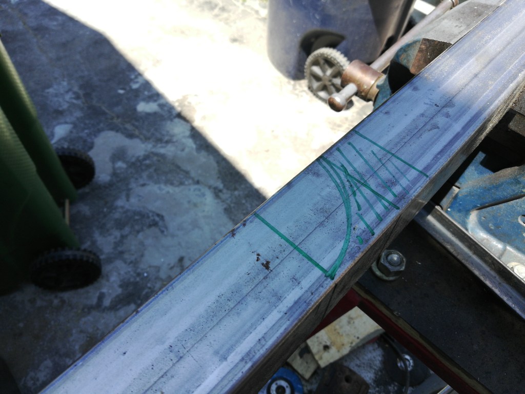 Figuring out the measurements is relatively easy. It’s a quarter circle, so the distance of the cuts is 3.14 x the height (or width of the steel – let’s say it is about 2″ x 4″, then the diameter is 8″ because 4″ x 2) all of that divided by 4. So Pi x D / 4.