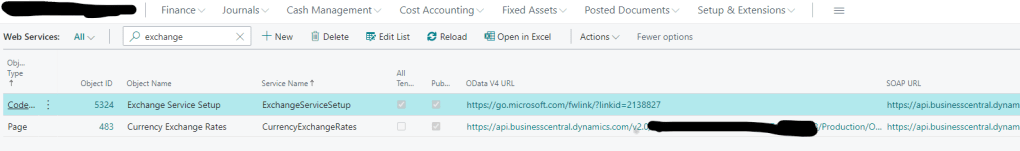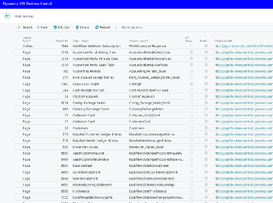 Services listed under Web Services in Business Central