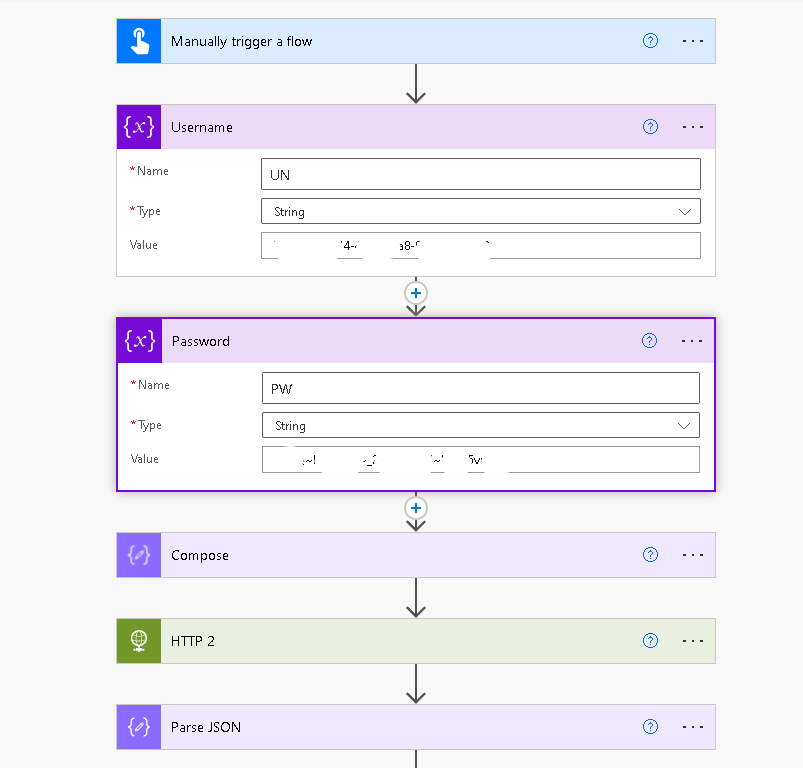 Initialize another variable and assign it a name Password or PW. It is also a STRING variable and paste the SECRET (password) that you got from Azure into the value field