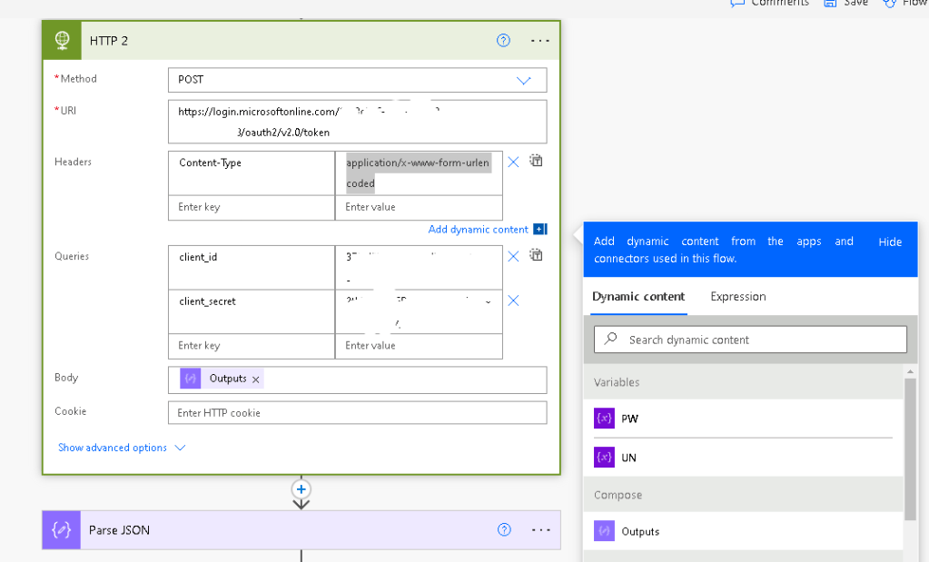 Add a new step using COMPOSE. Add this line into the Expression (with all the quotes, but replace XXXX with the Client ID from above and YYYY with the Secret (password) from above: