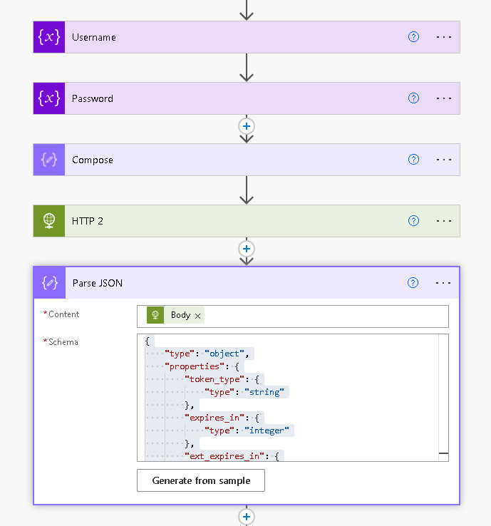 Add another step and use the Parse JSON function. Use the Body from the HTTP request above under CONTENT. Use this as the schema (note you may have additional fields for your customization):