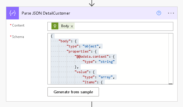 Add an Apply to Each step under SELECT AN OUTPUT FROM PREVIOUS STEPS I added this expression: outputs(‘Parse_JSON_DetailCustomer’)?[‘body’]?[‘value’]