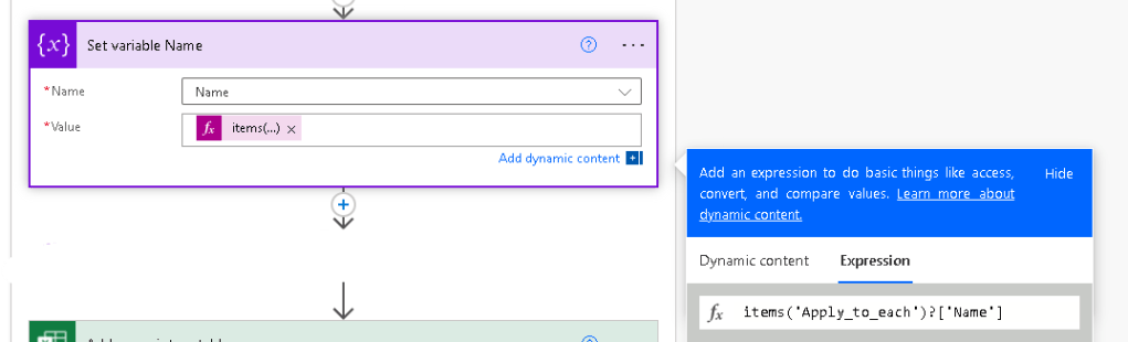 Now assign the value to the variable by using the set variable step and using this expression: items(‘Apply_to_each’)?[‘Name’] Note that the Apply_to_each is the title for this step