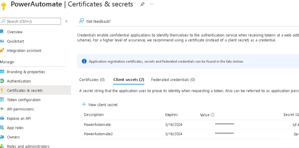 Select Certificates & Secrets and then click on New Client Secret