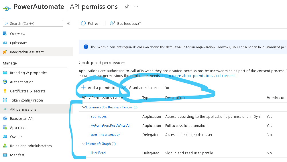 Now click on API permissions and make sure these permissions are added. So click on Add a permission and on the next screen select Microsoft APIs and look for Business Central. Select Business Central and then select DELEGATED PERMISSIONS. I selected app_access/Automation.ReadWrite.All/user_impersonation. I do not believe that you need to Financials.ReadWrite.All.