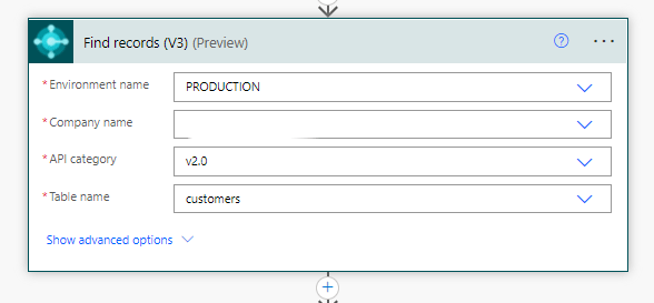 Step 1: Use the Business Central Connector in PowerAutomate and use the FIND RECORDS (V3). You will need to input the Environment Name (usually Production) and then the company name. Use the API v2.0, and for my case, I used the customers table.
